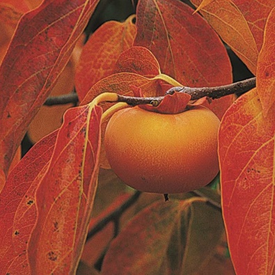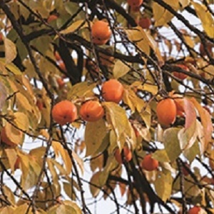 American persimmon trees are very attractive with an upright form and distinctive ‘alligator hide’ bark pattern. Waxy, blue-green droopy leaves turn a striking golden yellow in the fall with their orange, golf ball sized fruit which ripens very late, often hanging on the tree after the leaves drop. When fully ripe, persimmons are soft and honey-sweet with a dash of spice. The unusual, delectable flavour possibly explains the Latin name for persimmon which means ‘food of the gods’.