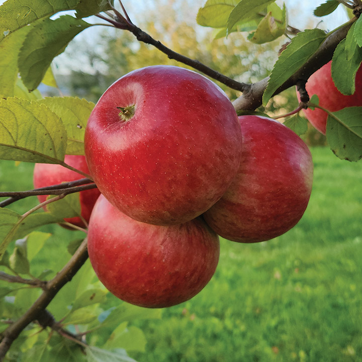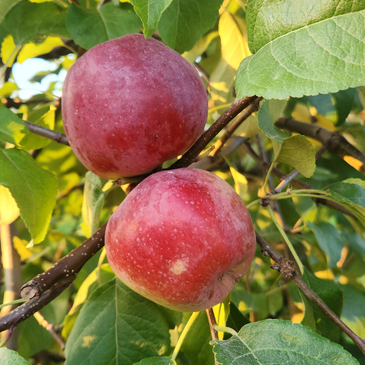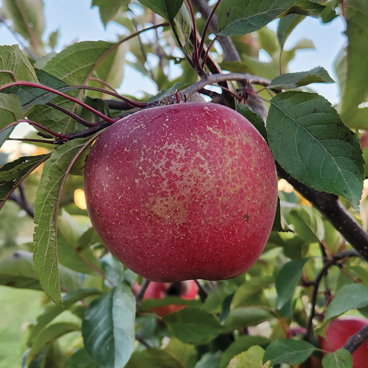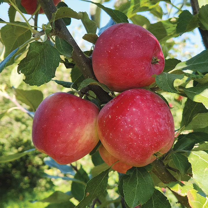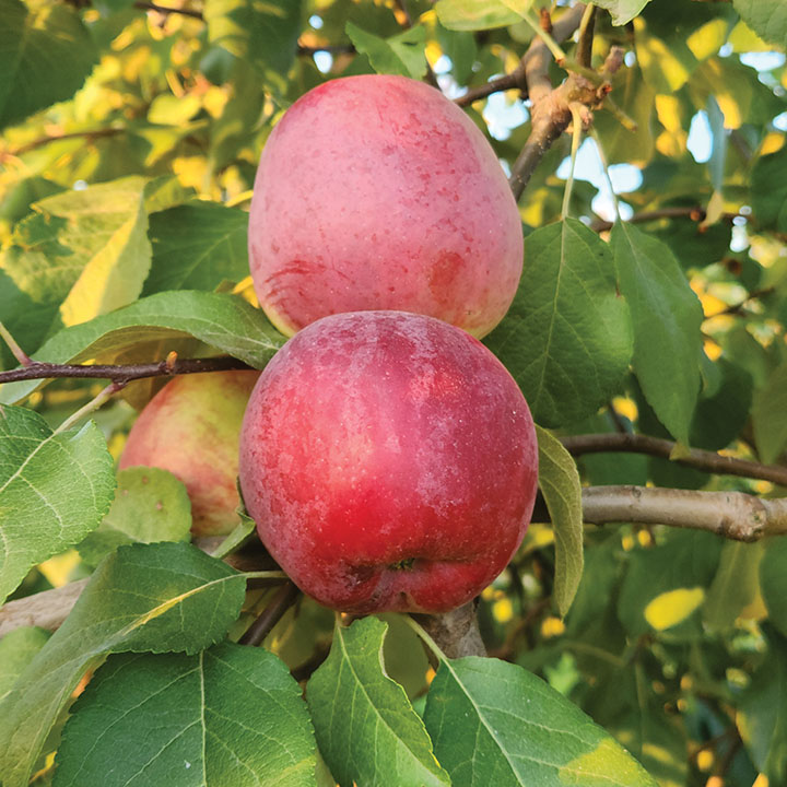 The original Fuji was developed in Fujisaki, Japan and quickly gained a following all over the world. As the author Rowan Jacobsen says, 'It's off-the-charts sweetness, concentrated Asian tropical fruit flavours, and showers of juice were like nothing that had been seen before.' Orchardists everywhere wanted to grow it, and although its' hardiness allows it to go north, you need a really long summer to ripen it. Daybreak™ is a natural mutation discovered in Orrtana, PA, that maintains the sweet flavour and famous Fuji crunch, but ripens 4-5 weeks earlier. Like the original Fuji, Daybreak™ can be stored all winter.