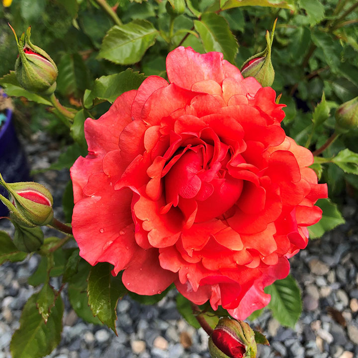When Foxy Lady sets the bush aflame, the luminous floral glow will definitely turn heads. Her ravishing russet flowers are described by our friends at Palestine Roses like this - '…one-of-a-kind coppery orange fading into the most sumptuous shades of smoky salmon'. As the frilly blooms age, their richly coloured, wavy petals open wide to display the orange stamens to any passing pollinator. Foxy Lady's presence is accompanied by a discreet, spicy tea aroma, and highlighted with clean, glossy foliage. Her resumé also reads - rain tolerant, self-cleaning, and drought resistant.