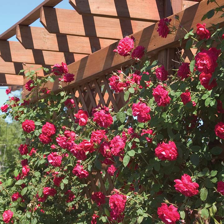 This charming First Edition® climber was Rose of the Year in 2015. These exquisitely formed blooms are the epitome of the classic red rose. Ramblin' Red® matches the cold hardiness of it's highly regarded parent 'Henry Kelsey', but surpasses it in disease resistance, while also featuring fuller flowers of a richer crimson-red. Vigorous, healthy plant with strong, pliable canes can reach 2-3m (6-10') and keeps blooming from late spring through summer.