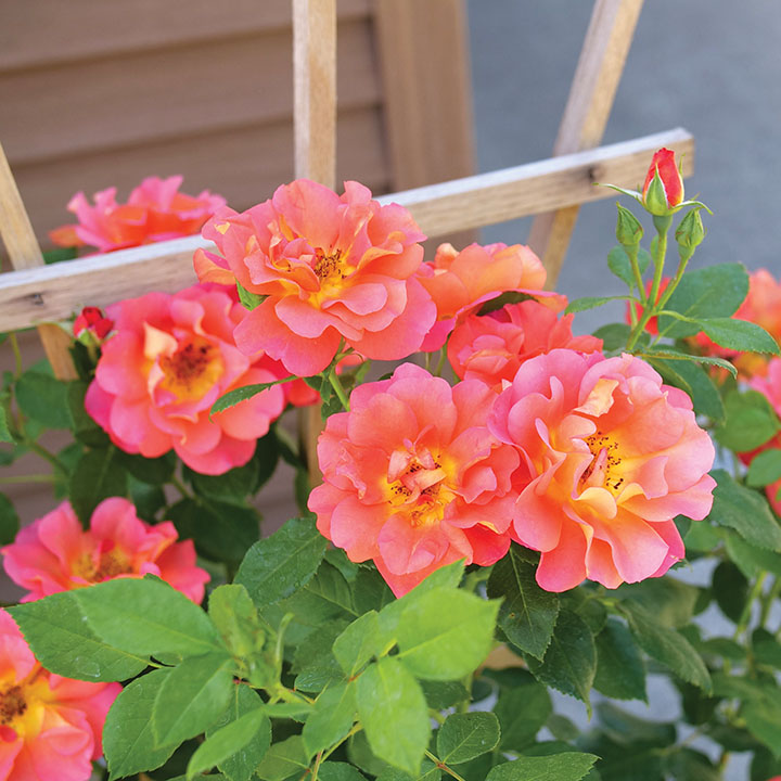 Reignite a passion for roses with the blazing colour of this hot new climber. Large, luscious orange blooms accentuated by smoldering yellow eyes liven up the landscape all summer long, whether grown on it's own or trained up a trellis, column, or wall. Super-clean, glossy, dark green foliage looks even more outstanding when contrasted by the exceptional brightness of flowers. Another winner bred by Pheno Geno of Serbia. Mature size is 1-1.5m (3-5') tall × 60-90cm (2-3') wide.